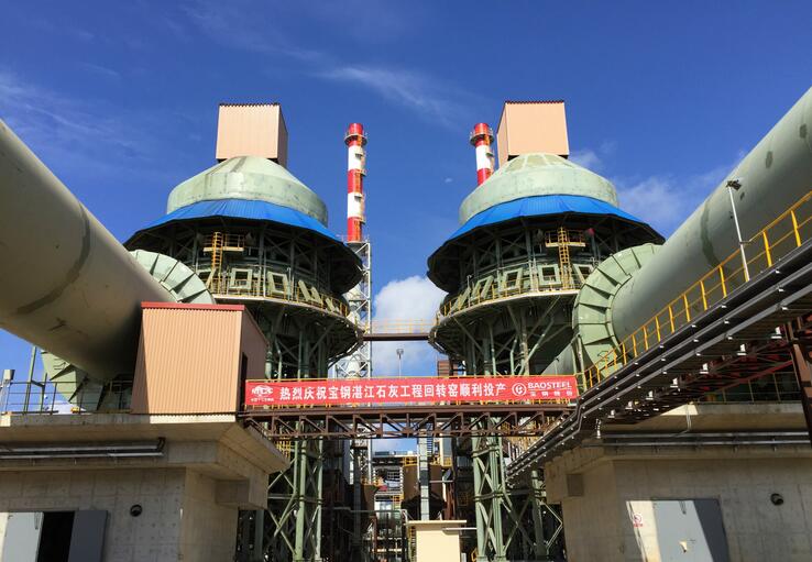 廣東湛江鋼鐵基地石灰工程主要由原料儲運(yùn)系統(tǒng)、焙燒系統(tǒng)、成品儲運(yùn)篩分系統(tǒng)、石灰石破碎系統(tǒng)、輕燒白云石篩分壓球系統(tǒng)、配套公輔系統(tǒng)組成,一步工程設(shè)計(jì)建設(shè)兩座1000TPD回轉(zhuǎn)窯,設(shè)計(jì)產(chǎn)能活性石灰46.53萬噸/年、輕燒白云石17.86萬噸/年;剞D(zhuǎn)窯焙燒采用豎式預(yù)熱器→回轉(zhuǎn)窯→豎式冷卻器工藝布置,通過預(yù)熱器的預(yù)分解、回轉(zhuǎn)窯的高溫煅燒,生產(chǎn)出高品質(zhì)的活性石灰和輕燒白云石,主要為煉鋼系統(tǒng)服務(wù)。其中工程主要設(shè)備——鍛燒回轉(zhuǎn)窯,規(guī)格為