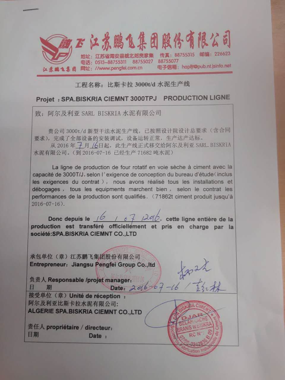賀江蘇鵬飛集團(tuán)總包阿爾及利亞比斯卡拉日產(chǎn)3000噸水泥生產(chǎn)線投產(chǎn)正常運(yùn)行